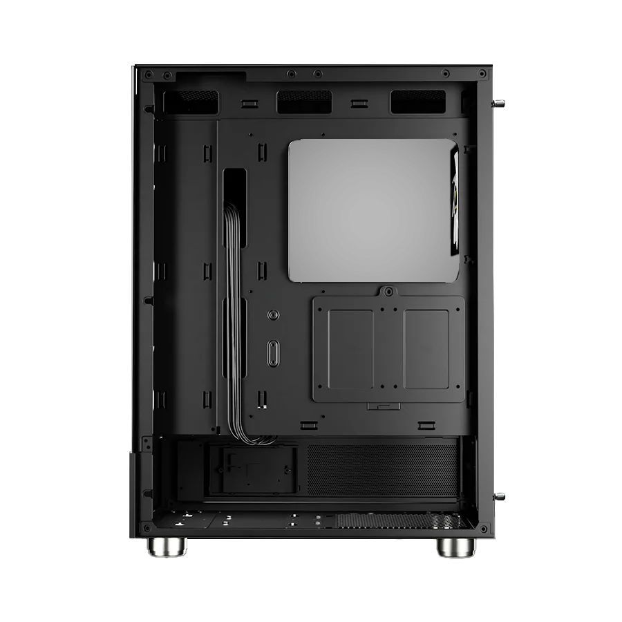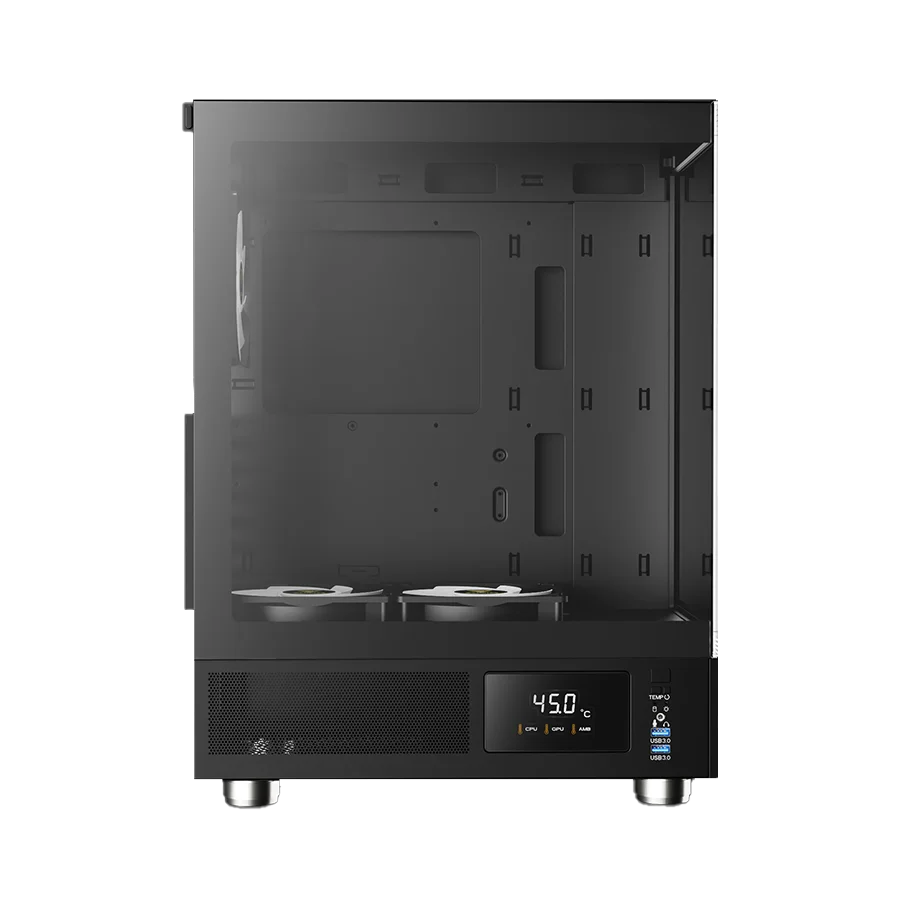 سه فن ARGB PWM از پیش نصبشده همراه با هاب داخلی، جریان هوای بهینه و جلوههای نوری متنوع را تضمین میکنند. مسیرهای تهویه در محفظه PSU و کنارهها نیز جریان هوا را به شکلی مؤثر هدایت میکنند.