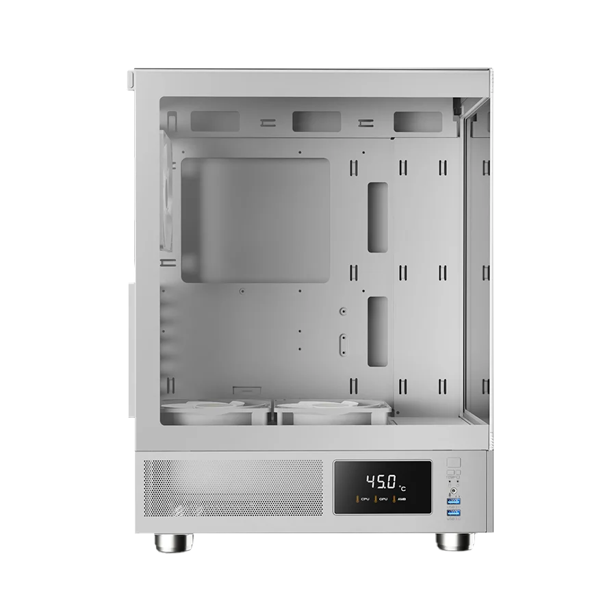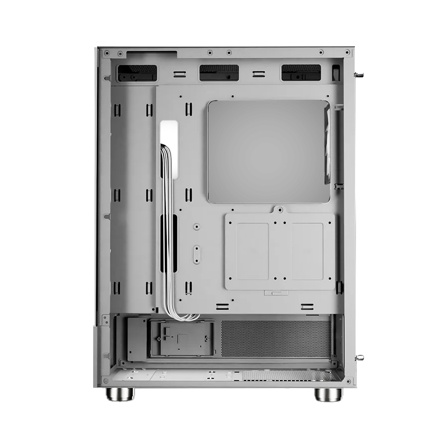 کیس Gamdias ATLAS E1 WH با ساختار Mid-Tower و پنل‌های شیشه‌ای یکپارچه، جلوه‌ای شفاف و مدرن از اجزای داخلی ارائه می‌دهد. این طراحی علاوه بر زیبایی، امکان نمایش اسمبل تمیز و نورپردازی داخلی را فراهم می‌سازد.
