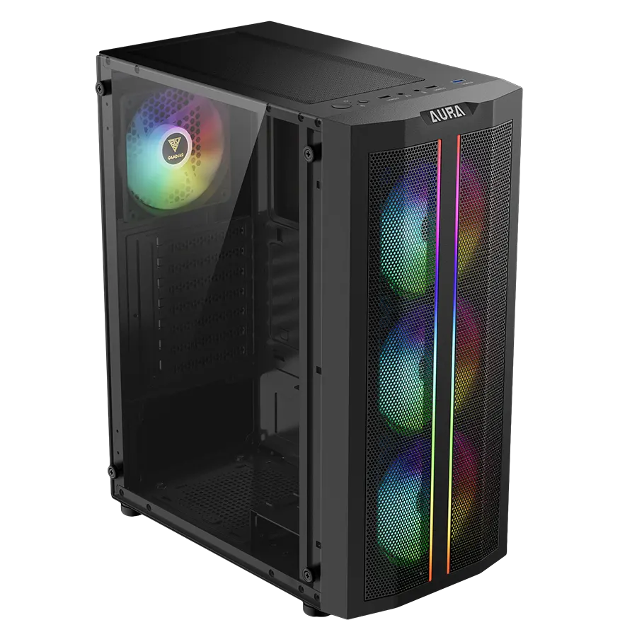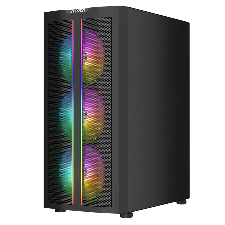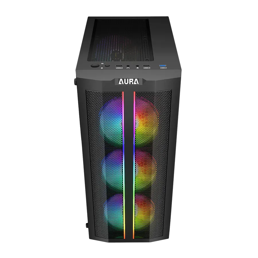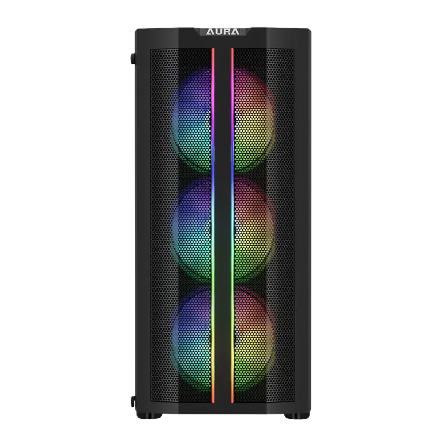 پنل جلویی Mesh RGB در AURA GC3 ELITE ترکیبی از دو نوار LED در قسمت جلو و طراحی مش باز با منافذ هوایی زیاد است که اجازه میدهد سه فن ۱۲۰ میلیمتری RGB در جلو به صورت از پیش نصبشده و یک فن در عقب جریان هوای خوبی ایجاد کنند. این طراحی مشباز در کنار LEDها نه تنها ظاهر بصری جذاب دارد، بلکه با کاهش مقاومت جریان هوا در قسمت جلو کمک میکند گرما سریعتر از سمت پردازنده و کارت گرافیک دفع شود.
