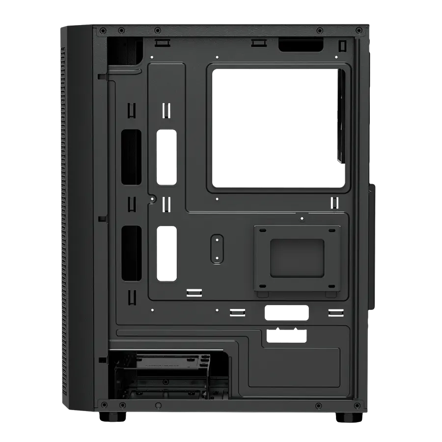 پنل جانبی Tempered Glass به صورت صفحهای بزرگ و قابل نصب بدون ابزار طراحی شده است که با شفافیت بالا، نمای کاملی از اجزای داخلی را نمایش میدهد. ساختار استفاده شده به گونهای است که در کنار پنل جلو Mesh، ترکیب دید شفاف و خنکسازی بهینهتری ارائه میدهد. اجزای داخلی مانند فضای نصب کارت گرافیک تا حدود ۲۶۰ میلیمتر، ارتفاع خنککننده پردازنده حداکثر تا ۱۶۰ میلیمتر و طول PSU تا ۱۵۰ میلیمتر در نظر گرفته شدهاند تا سازگاری خوبی با سختافزارهای متوسط داشته باشد.