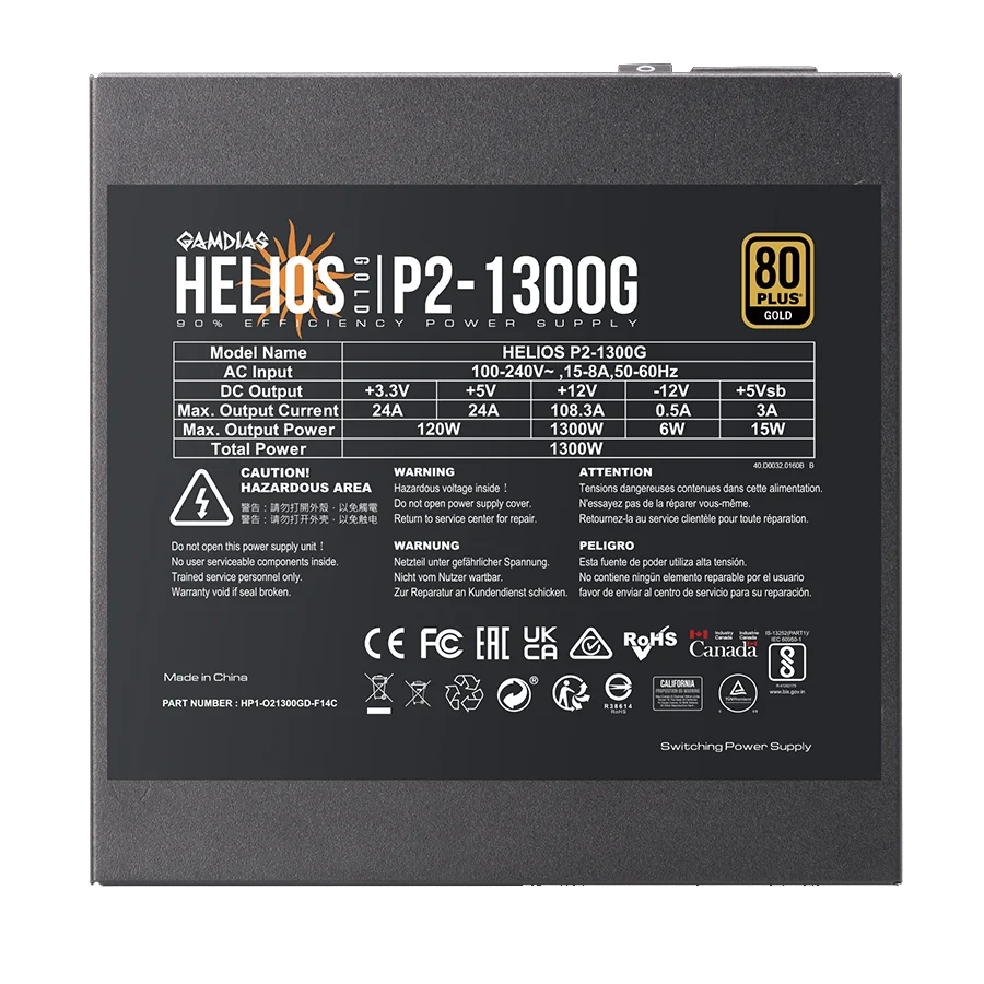 پاور گیمینگ گیم دیاس GAMDIAS HELIOS P2-1300G یکی از قدرتمندترین منابع تغذیه سری هلیوس است. این مدل توان خروجی1300 وات واقعی دارد و توان پیک آن به1690 وات میرسد. استاندارد ATX12V v3.0 و گواهینامه 80 PLUS Gold باعث راندمان بالا و پایداری عالی میشود.