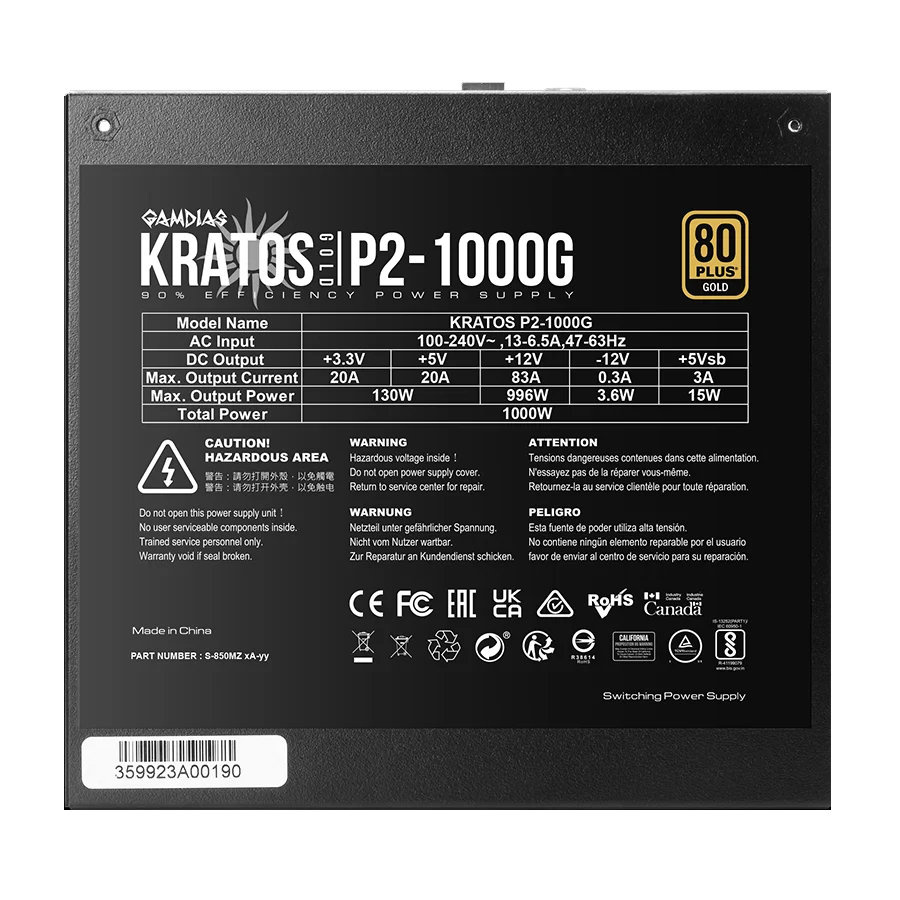 پاور گیمینگ گیم دیاس KRATOS P2-1000G یک منبع تغذیه 1000 وات واقعی است. این مدل از استاندارد ATX12V v3.0 پشتیبانی میکند. راندمان انرژی آن با گواهینامه 80PLUS Gold تضمین شده است. همچنین به فناوری Active PFC با ضریب توان 0.99 مجهز است.