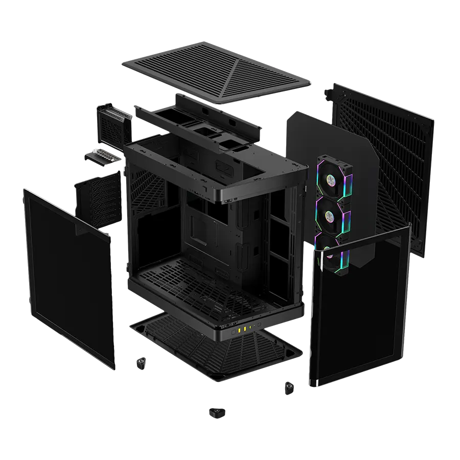 کیس گیمینگ گیم دیاس Gamdias NESO P1 PRO دارای فرمی است که امکان استفاده به صورت افقی یا عمودی را می‌دهد. پنل‌های شیشه‌ای پانورامیک جلو و کناره با لولاهای دو طرفه (dual-hinged) باز می‌شوند تا دسترسی آسان به اجزای داخلی فراهم شود. پایه‌های مغناطیسی امکان تغییر جهت کیس را بدون پیچ‌گوشتی فراهم می‌آورند.