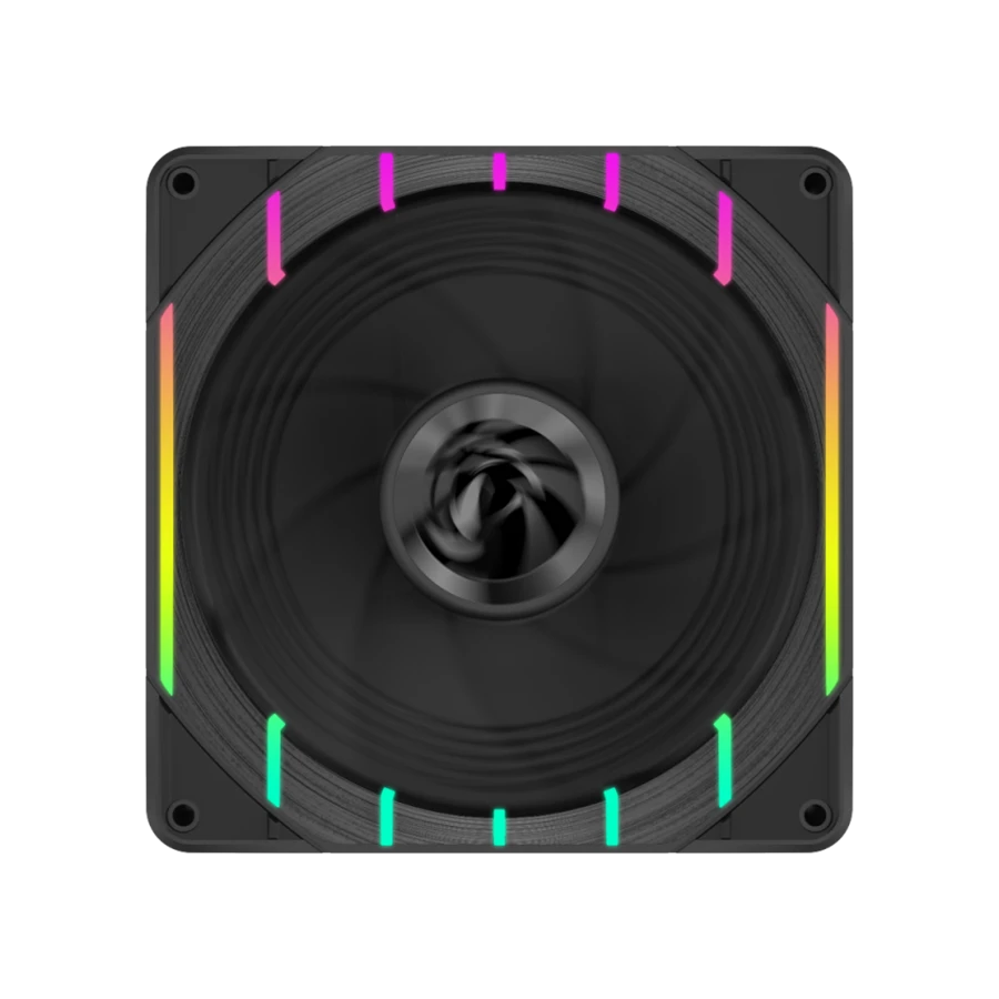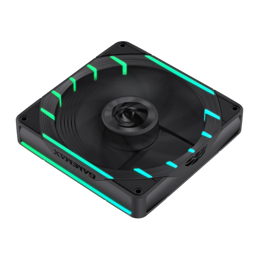 این فن از بدنه مشکی و پرههای معکوس مشکی بهره میبرد که هماهنگی کاملی با کیسهای مشکی و سیستمهای مینیمال ایجاد میکند. حلقه نورپردازی بیرونی با بیستوچهار LED از نوع ARGB جلوهای یکنواخت و چشمگیر ارائه میدهد. کاربران میتوانند افکتهای نورپردازی را بهصورت مستقیم با مادربرد همگامسازی کنند و جلوهای یکپارچه بسازند. طراحان گیم مکس با استفاده از الگوی نوری ویژه، جلوهای شبیه به نشان چنگال گیمینگ ایجاد کردهاند.