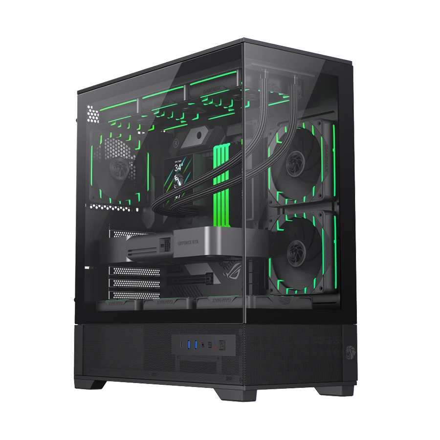 کیس گیمینگ گیم مکس GAMEMAX VISTA 2 AB با تمرکز بر طراحی مدرن و نمایش کامل قطعات داخلی تولید شده است و بهوسیله پنل شیشهای حرارتدیده با نمای پانورامیک ۲۷۰ درجه، دیدی گسترده و حرفهای در اختیار کاربر قرار میدهد. پنل جلویی ترکیبی از شیشه و مش بوده و تعادل مناسبی میان زیبایی و تهویه ایجاد میکند. استفاده از کاور فلزی در قسمت بالا و سمت راست، ساختار بدنه را مستحکم کرده و هماهنگی ظاهری مناسبی با شیشه سمت چپ به وجود آورده است.