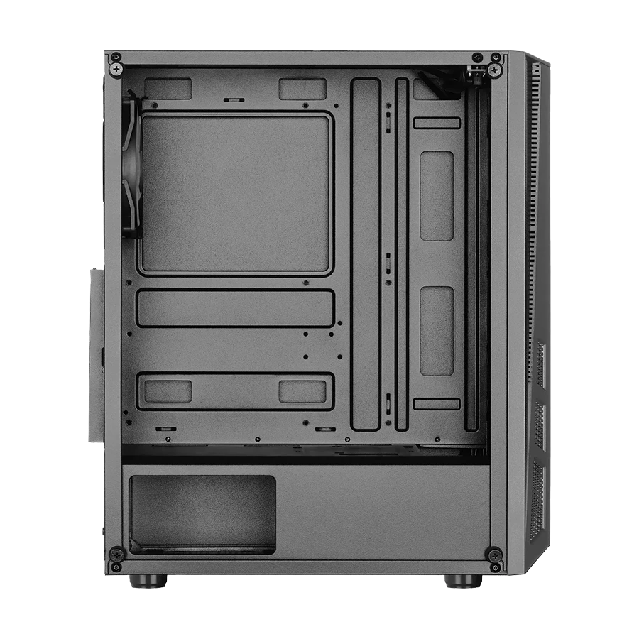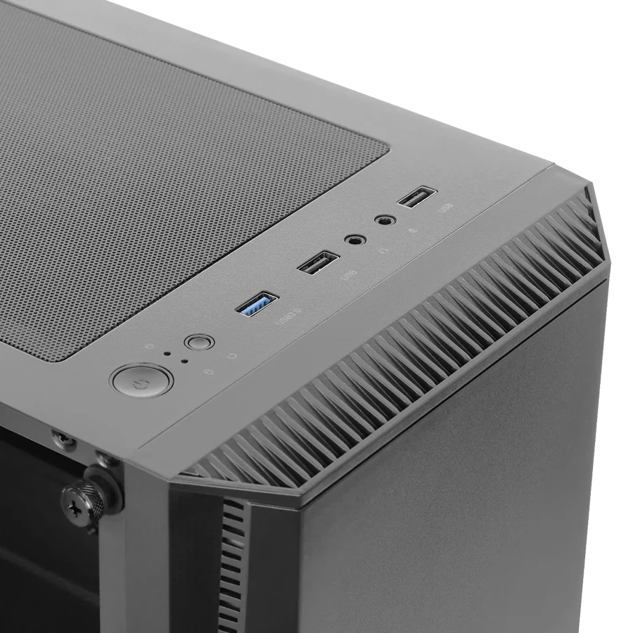 این مدل مجهز به یک پورت USB 3.2 Gen1، دو پورت USB 2.0 و خروجی صدای HD Audio است که دسترسی سریع و راحت کاربر به درگاههای مهم را ممکن میکند. کاور کناری شیشه حرارتدیده دودی علاوه بر استحکام بالا، جلوه نورپردازی داخلی را تقویت میکند و جلوهای حرفهای و مدرن به سیستم میبخشد. این شیشه مقاوم همچنین دید مناسبی از قطعات داخلی فراهم میکند و انتخابی ایدهآل برای کاربران علاقهمند به RGB محسوب میشود.
