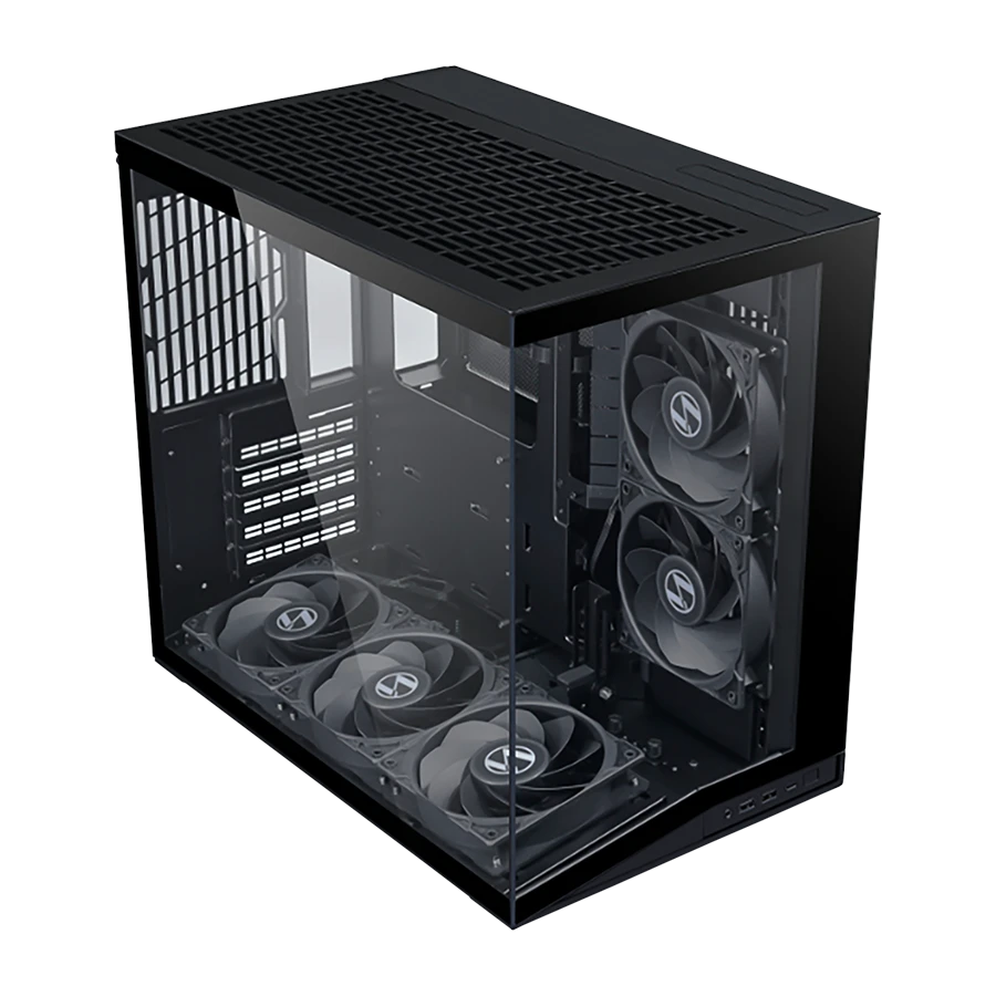 یکی از ویژگیهای مهم کیس O11D MINI V2 ، طراحی زاویهدار ۱۰ درجهای در بخش کف است. که جریان مستقیم هوا را به سمت GPU هدایت میکند. این ساختار موجب بهبود قابل توجه دمای کارت گرافیک و عملکرد پایدارتر در بازیهای سنگین میشود. پشتیبانی از حداکثر ۹ فن ۱۲۰ میلیمتری و وجود فیلتر گرد و غبار در بخش زیرین، سیستم را همیشه خنک و تمیز نگه میدارد. همچنین قابلیت برداشتن ماژول I/O پایینی برای بهبود جریان هوای ورودی تعبیه شده است تا عملکرد خنککننده به حداکثر برسد.
