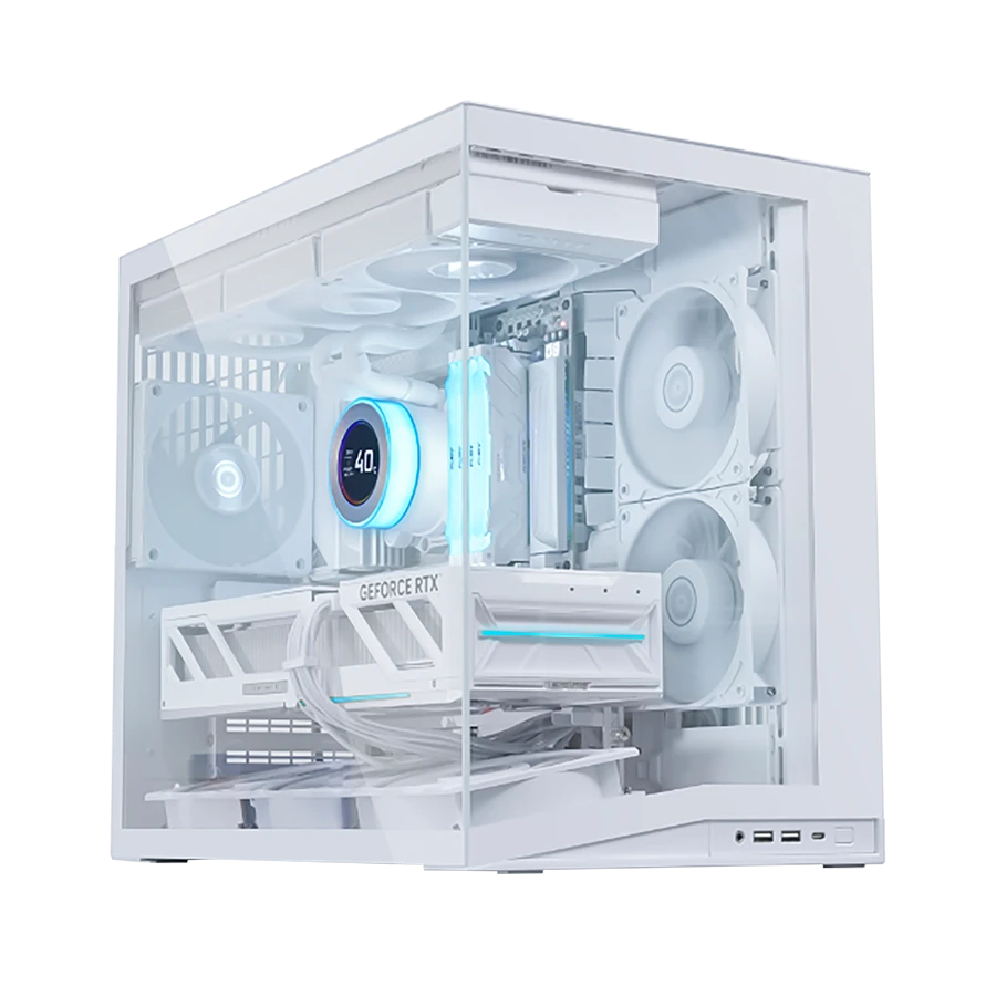 این کیس امکان نصب کارت گرافیک به صورت افقی یا عمودی را به همراه براکت ضد افتادگی GPU فراهم میکند. پایههای آلومینیومی محکم، ثبات سیستم را تضمین کرده و ظاهر کلی کیس را ارتقا میدهند. براکت عمودی قابل تنظیم، از افتادگی کارتهای گرافیک سنگین جلوگیری میکند و ظاهری تمیز و منظم ارائه میدهد.