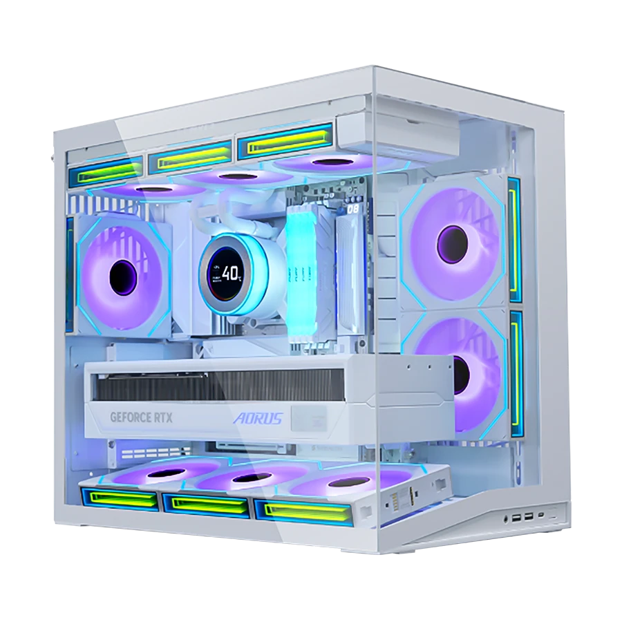 این کیس امکان نصب کارت گرافیک به صورت افقی یا عمودی را به همراه براکت ضد افتادگی GPU فراهم میکند. پایههای آلومینیومی محکم، ثبات سیستم را تضمین کرده و ظاهر کلی کیس را ارتقا میدهند. براکت عمودی قابل تنظیم، از افتادگی کارتهای گرافیک سنگین جلوگیری میکند و ظاهری تمیز و منظم ارائه میدهد.