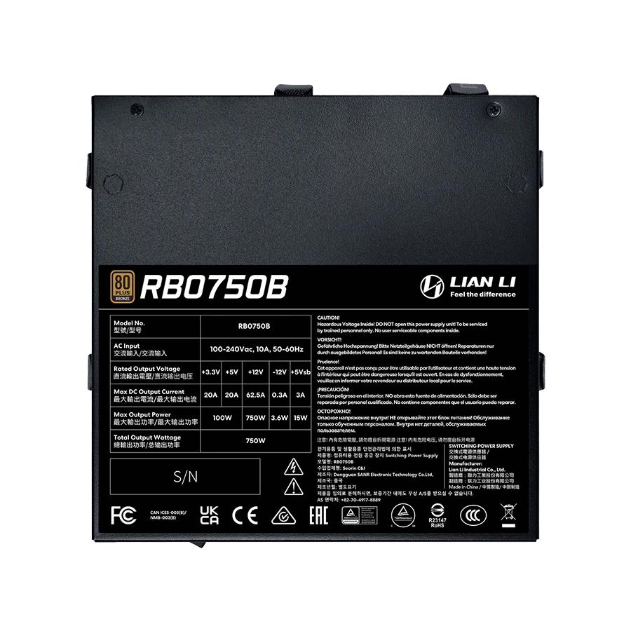 پاور – منبع تغذیه لیان لی Lian Li RB 750B یک منبع تغذیه حرفه‌ای با توان خروجی 750 وات است که برای سیستم‌های قدرتمند طراحی شده است. این محصول با استاندارد ATX12V 3.1 و فرم‌فاکتور ATX عرضه می‌شود تا با اکثر کیس‌ها و مادربردهای مدرن سازگار باشد. کابل‌کشی غیر ماژولار آن به صورت ثابت متصل است که باعث سادگی نصب و کاهش احتمال اتصالات ناپایدار می‌شود. همچنین بدنه‌ای فشرده با ابعاد 150 میلی‌متر دارد که نصب آن را در بیشتر کیس‌ها آسان می‌کند.