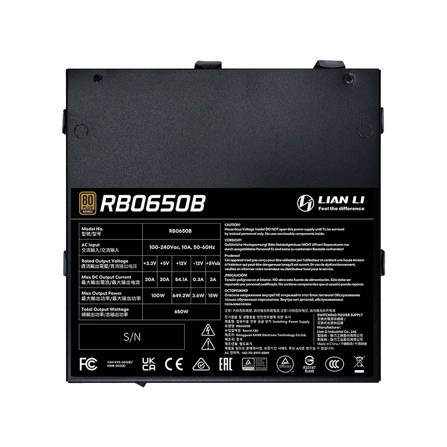 پاور – منبع تغذیه لیان لی Lian Li RB 650B یک منبع تغذیه حرفه‌ای با توان خروجی 650 وات است که برای سیستم‌های قدرتمند طراحی شده است. این محصول با استاندارد ATX12V 3.1 و فرم‌فاکتور ATX عرضه می‌شود تا با اکثر کیس‌ها و مادربردهای مدرن سازگار باشد. کابل‌کشی غیر ماژولار آن به صورت ثابت متصل است که باعث سادگی نصب و کاهش احتمال اتصالات ناپایدار می‌شود. همچنین بدنه‌ای فشرده با ابعاد 150 میلی‌متر دارد که نصب آن را در بیشتر کیس‌ها آسان می‌کند.