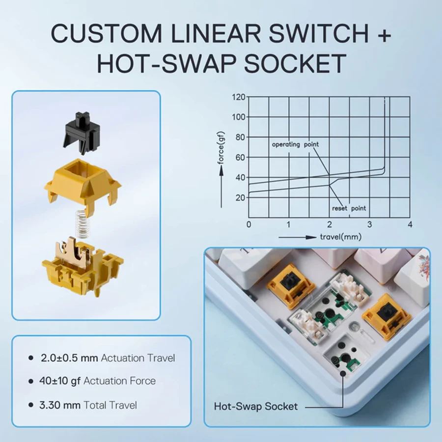 سوئیچهای خطی Hi-Fi این کیبورد حس تایپ نرم، سریع و دقیق را منتقل میکنند. این سوئیچها با روغنکاری حرفهای و طراحی گسکت، فیدبک الاستیک و لذتبخشی ایجاد میکنند. قابلیت هاتسوآپ نیز امکان تعویض سریع سوئیچها را بدون نیاز به لحیمکاری فراهم کرده است. این ویژگی انعطاف زیادی به کاربران حرفهای میدهد تا تجربه تایپ و بازی خود را مطابق سلیقهشان شخصیسازی کنند.