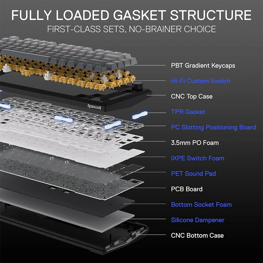 در ساخت کیبورد Redragon Freyja K687 GG PRO از ساختار Gasket حرفه‌ای استفاده شده است. این طراحی با کمک لایه‌های متعدد فوم و سیلیکون، ضربه کلیدها را نرم‌تر و یکنواخت‌تر منتقل می‌کند. استفاده از پنج لایه کاهش‌دهنده صدا، نویز توخالی را به‌طور چشمگیری کاهش داده و صدایی شفاف و کنترل‌شده ایجاد می‌کند. نتیجه این ساختار، تجربه تایپ نرم، آرام و بسیار لذت‌بخش است.