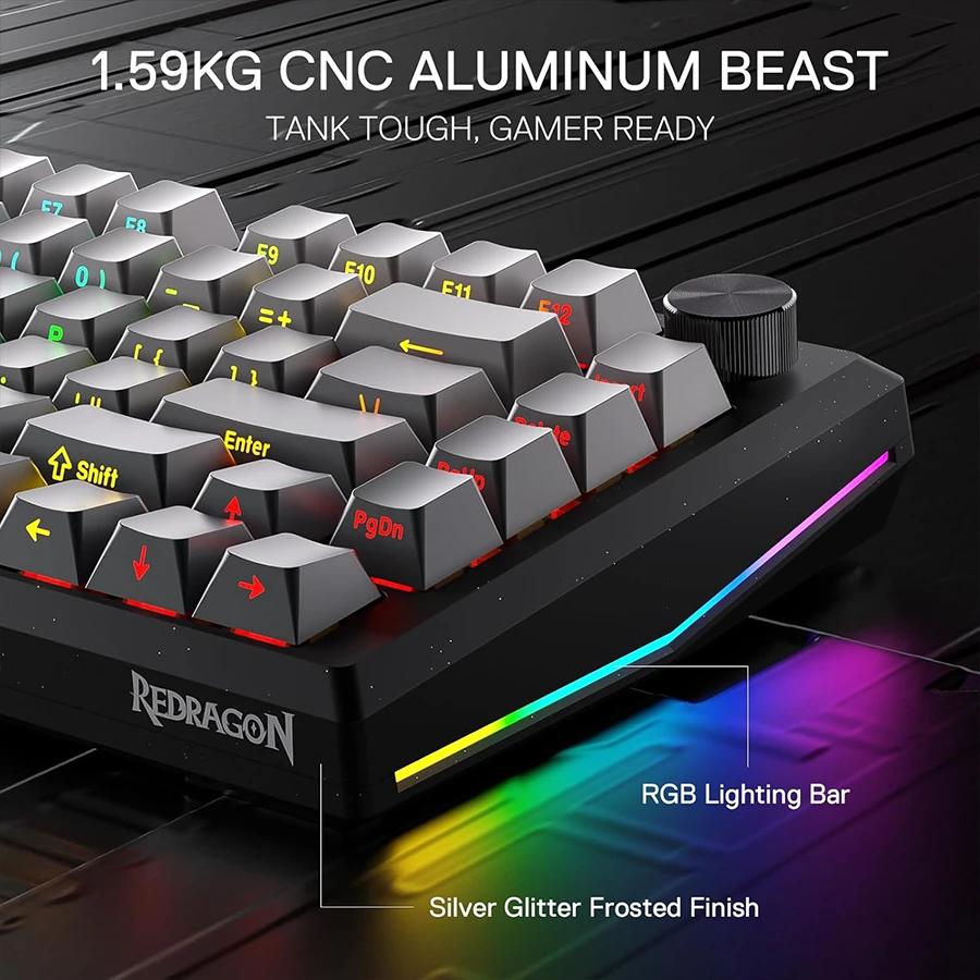 کیبورد بی سیم مکانیکال گیمینگ ردراگون Redragon Freyja K687 GG PRO با طراحی صنعتی و بدنه تمام آلومینیومی CNC عرضه می‌شود. استفاده از آلومینیوم یکپارچه با پوشش مات، حس استحکام، کیفیت بالا و ظاهری حرفه‌ای به کاربر منتقل می‌کند. رنگ طوسی و مشکی این مدل، جلوه‌ای مدرن و مینیمال ایجاد کرده و به‌خوبی با ستاپ‌های گیمینگ هماهنگ می‌شود. وزن مناسب بدنه، ثبات کیبورد را روی میز افزایش داده و لرزش ناخواسته را کاهش می‌دهد.