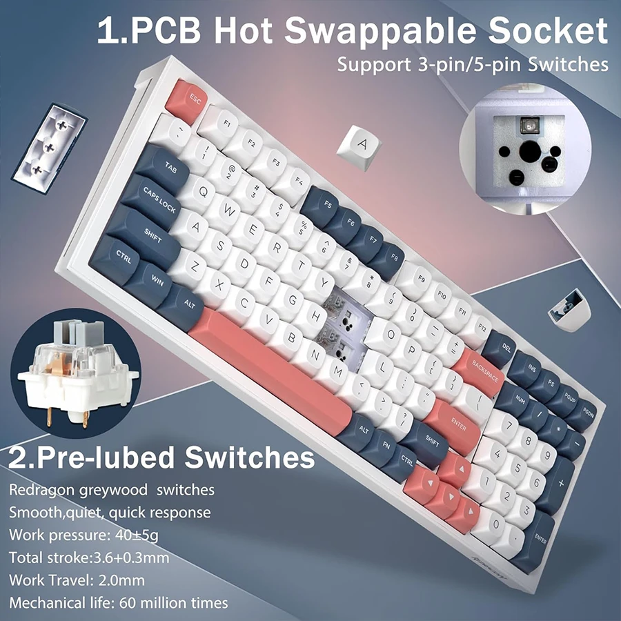 کیبورد Redragon K723 WBR PRO RGB از سوئیچهای Hot Swappable بهره میبرد. کاربر میتواند بدون نیاز به لحیمکاری، سوئیچهای 3 پین یا 5 پین را تعویض کند. ساختار Gasket به همراه لایههای سیلیکونی و فومهای جذب صدا، تجربه تایپ نرمتری ایجاد میکند. این طراحی نویز ضربه کلیدها را کاهش داده و حس حرفهایتری منتقل میکند.