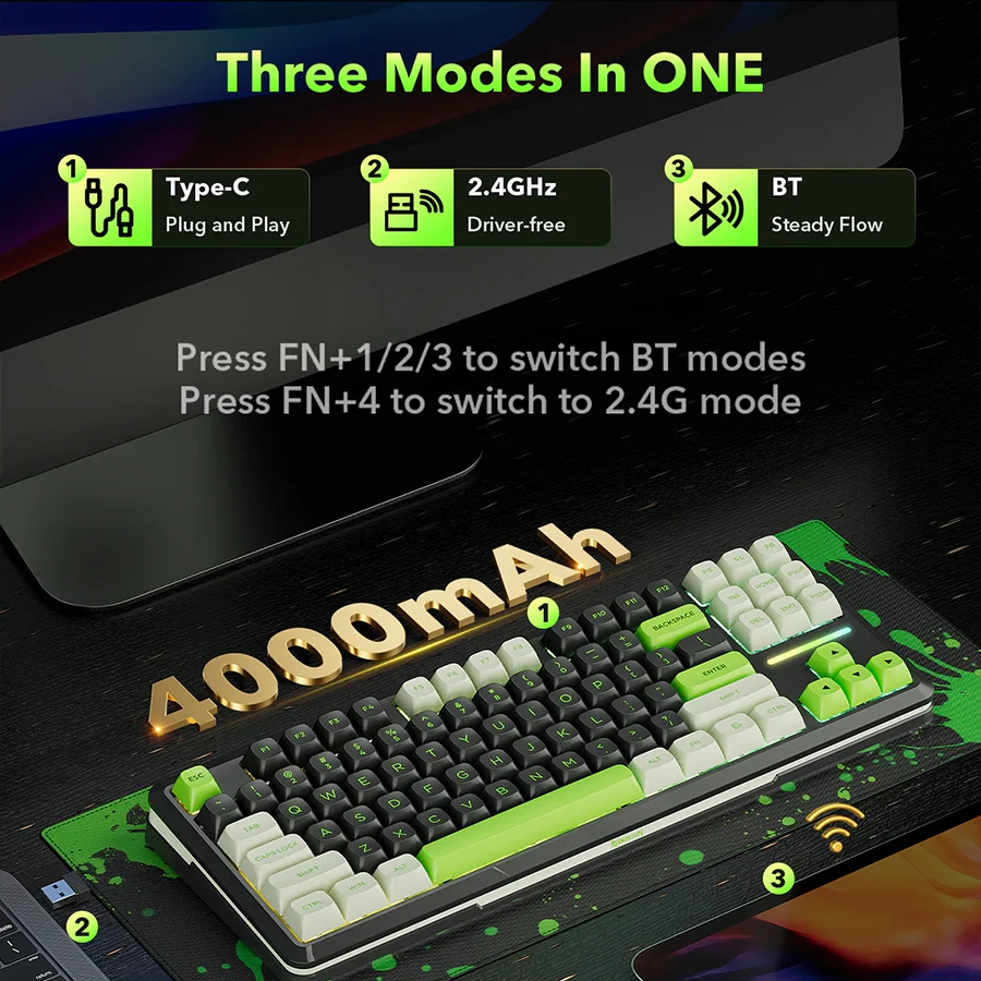 کیبورد گیمینگ ردراگون K734 BWG PRO RGB از اتصال سهحالته پشتیبانی میکند. این کیبورد از طریق کابل Type-C، بلوتوث و دانگل 2.4 گیگاهرتز به دستگاهها متصل میشود. کاربر میتواند بین حالتهای اتصال بهسرعت جابهجا شود. برد اتصال بی سیم تا ده متر عملکرد پایدار ارائه میدهد. این ویژگی برای کاربرانی که چند دستگاه دارند بسیار کاربردی است. اتصال سریع و بدون تأخیر تجربه کاربری روانی ایجاد میکند.
