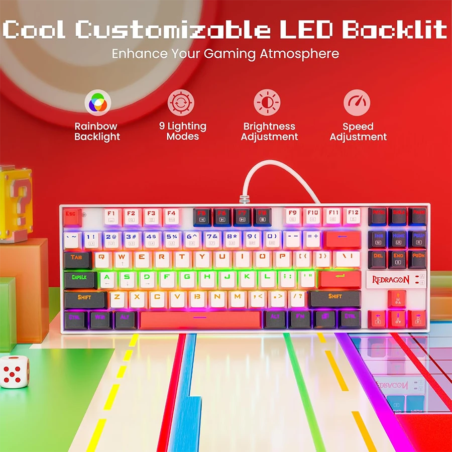 کیبورد مکانیکال گیمینگ ردراگون Redragon KUMARA K552 WLR RGB با طراحی مدرن و بدنه فلزی مقاوم عرضه میشود. نورپردازی RGB پویا با شش حالت متنوع، جلوهای جذاب و حرفهای به میز گیمینگ کاربران اضافه میکند. امکان تنظیم شدت نور و افکتها باعث میشود کاربر فضای کاری یا گیمینگ دلخواه خود را بسازد.